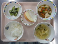 ごはん マーボー豆腐 わかめの酢のもの ニラ卵スープ りんご |