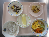 | グレープゼリー | ゆかりごはん がんもどきの煮付け 切り干し大根とひじきのサラダ 五目そうめん グレープフルーツ |