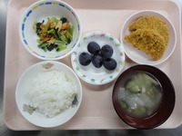 ごはん ミンチカツ 小松菜とじゃこの炒め物 みそ汁 ぶどう |