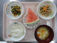 ごはん 野菜たっぷり豚肉の生姜焼き ほうれん草のナッツ和え みそ汁 すいか |