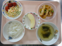 ごはん ぎょうざのあんかけ スパゲティーサラダ わかめスープ りんご |