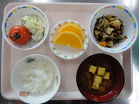 ごはん じゃが芋のひじき煮 ハムサラダ 冷たいすまし汁 オレンジ |