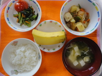 ごはん 厚揚げとじゃが芋のそぼろ煮 小松菜と人参の胡麻和え みそ汁 バナナ |