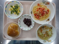 | 昆布おにぎり | ロールパン 冷製とまとパスタ いんげんの卵サラダ キャベツのベーコンスープ ぶどう |