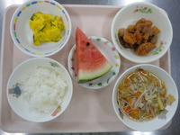 ごはん 鶏肉のケチャップ煮 かぼちゃと卵のサラダ ビーフンスープ すいか |