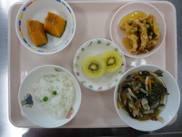 | フルーツヨーグルト | ごはん ぎょうざのあんかけ かぼちゃ煮 中華風スープ キウイ |