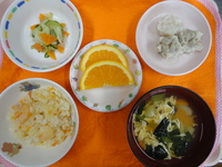 エビピラフ しゅうまい ごま酢キャベツ 洋風かきたま汁 オレンジ |