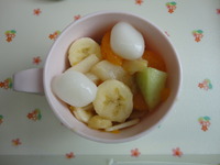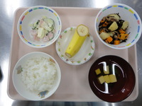 ごはん じゃがいものひじき煮 ハムサラダ 卵豆腐も冷やし汁 バナナ |
