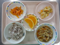 雑穀ごはん かきあげ にんじんのきんぴら 煮込みうどん オレンジ |