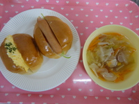 | 【保育参観日】 ホットドッグ エッグロール 彩りコンソメスープ |