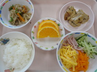 | いちごミルク | ごはん がんもどきの煮つけ れんこんのきんぴら 五目そうめん オレンジ |