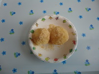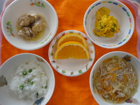 | きなこおはぎ | ごはん 鶏のマーマレード煮 かぼちゃと卵のサラダ ビーフンスープ オレンジ |