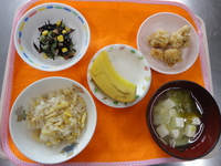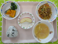 わかめおにぎり 焼きそば かぼちゃ煮 コーン卵スープ りんご |