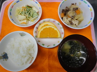 | りんごゼリー | ごはん すきやき風煮 スパゲティサラダ 納豆汁 オレンジ |