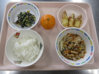 ちくわの天ぷら(カレ-味) 小松菜とひじきのごまマヨ和え 煮込みうどん ごはん みかん |