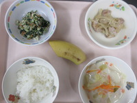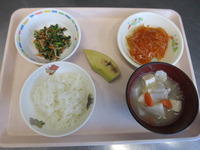 鶏肉のごまみそ焼き ほうれん草の白和え 野菜コ-ンス-プ ごはん バナナ |