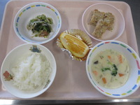 豆腐の松風焼き 小松菜ともやしのお浸し サ-モンシチュウ- ごはん はっさく |