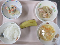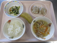 しゅうまい 小松菜とじゃこの和え物 ビ-フンス-プ ごはん バナナ |