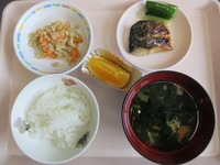 焼き鯖 卯の花 スティックきゅうり 冷やしすまし汁 ごはん オレンジ |