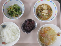 野菜たっぷり夏マ-ボ ブロッコリ-とコーンのおかか和え 野菜とウインナ-のスープ ごはん ぶどう |