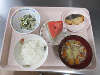 白身魚の西京焼き ほうれん草の白和え たぬき汁 ごはん すいか |