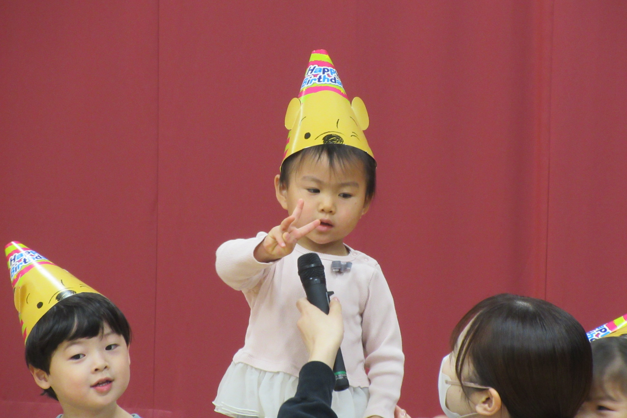 12月生まれのお友だちの誕生会がありました。10名の誕生児を紹介してお祝いした後は影絵クイズ!!手を使ったうさぎやティラノサウルスの人形などを使ったシルエットクイズは全問正解でした。 最後に♪ジングルベルを踊って楽しみました。サンタさんに聞こえたかな?