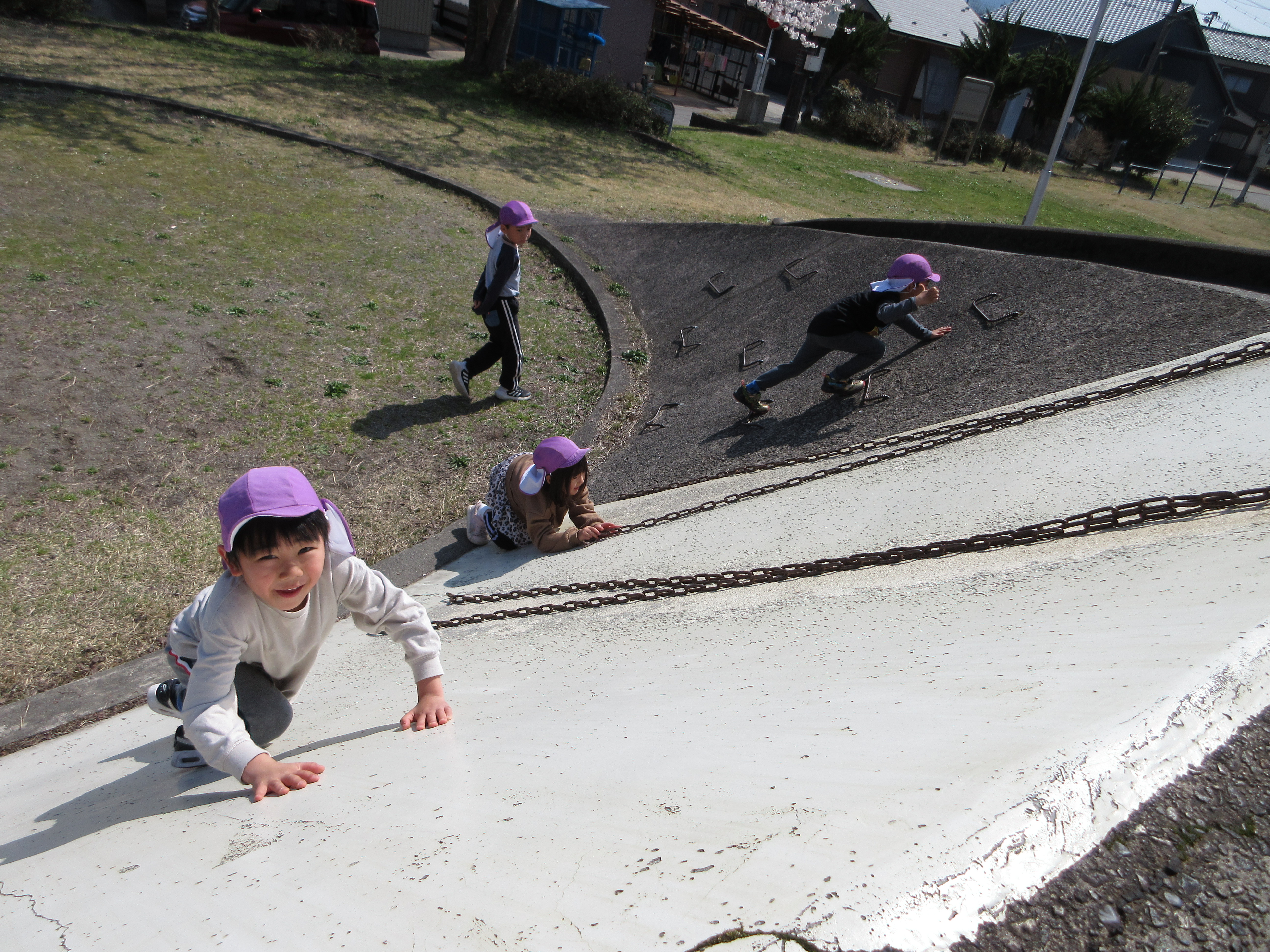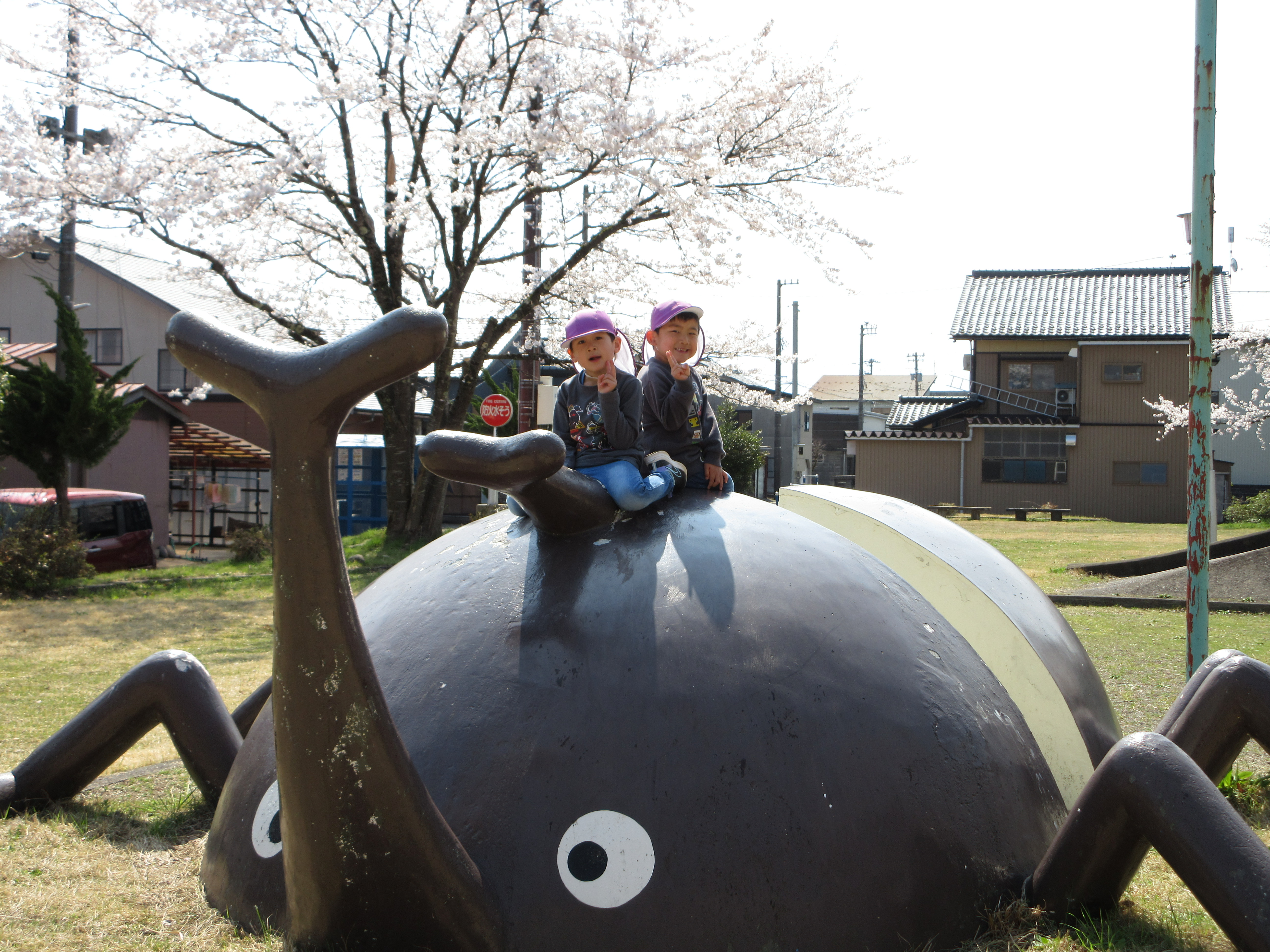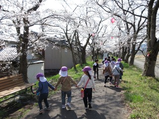 ぽかぽかで良いお天気なので勝山の弁天桜を見に行ってきました!満開の桜がとってもきれいで「ピンク色きれい💛」と喜んでいる子や「お土産にする!」と拾っている子もいました。桜の下をたくさん歩いていくと公園を発見!とっても嬉しそうに遊んでいました。道行く人にも元気いっぱいに挨拶をする素敵なあお組さんでした。
