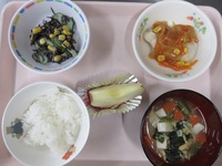 白身魚のカレ-あんかけ ひじきときゅうりのサラダ 青菜のみそかき玉汁 ごはん りんご |