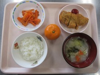 白身フライ キャベツとツナのホットサラダ 押し麦のス-プ ごはん みかん |