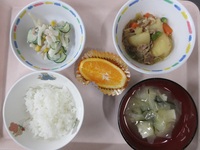 | 蒸しパン | 肉じゃが ツナサラダ みそ汁(わかめ) ごはん オレンジ |