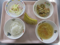 ハニ-スパイシ-チキン 白菜サラダ コ-ン卵ス-プ ごはん バナナ |