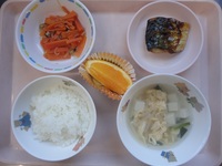 | ぽたぽたやき | 焼き鯖 にんじんのきんぴら にら卵のス-プ ごはん オレンジ |