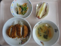 ソ-スかつ丼 小松菜とじゃこの和え物 わかめス-プ りんご |