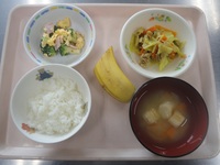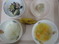 しゅうまい 小松菜とひじきのごまマヨ和え キャベツのベ-コンのス-プ ごはん バナナ |