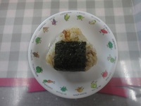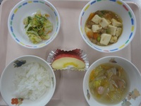 | 昆布おにぎり | マ-ボ-豆腐 ごま酢キャベツ 中華スープ ごはん りんご |