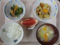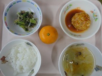 | グレ-プフル-ツ | 豆腐ハンバ-グ 小松菜ともやしのお浸し コンソメス-プ ごはん みかん |