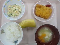 白身フライ スパゲティサラダ みそ汁(じゃが芋・たまねぎ) ごはん バナナ |