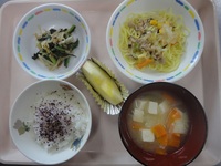 | 鮭わかめおにぎり | あんかけ焼きそば 小松菜ともやしのお浸し みそ汁(じゃが芋・玉ねぎ) ゆかりごはん りんご |