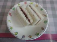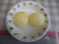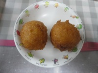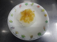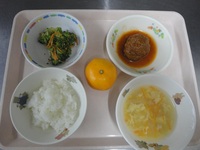| りんごゼリ- | ハンバ-グソ-ス煮 ブロッコリ-のごま和え コ-ン卵ス-プ ごはん みかん |