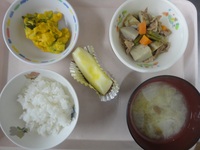 里芋と豚肉の煮物 かぼちゃと卵のサラダ なめこのみそ汁 ごはん りんご |