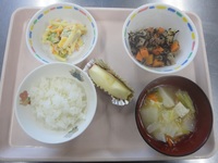| 塩せんべい | じゃがいものひじき煮 マカロニサラダ みそ汁(厚揚げ) ごはん りんご |