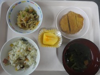 | おかかおにぎり | とんかつ 切干大根の含め煮 すまし汁(かまぼこ) 洋風きのこごはん 柿 |