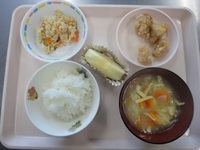 鶏肉のからあげ 卵の花 みそ汁(きゃべつの・揚げ) ごはん りんご |