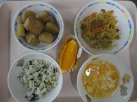 | さつま芋の甘煮 | 焼きそば 大豆とこんにゃくのサラダ コ-ン卵ス-プ 菜飯 オレンジ |