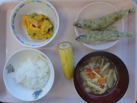 | 抹茶ホットケ-キ | ししゃもの天ぷら かぼちゃと卵のサラダ たぬき汁 ごはん バナナ |