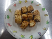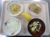 | カリカリト-スト | おさかなバ-グ 冷ばん三すう みそ汁(えのき) ごはん バナナ |