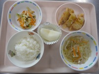 餃子のあんかけ キャベツの昆布和え そうラーメン ごはん 梨 |