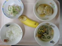 鶏のつくねあんかけ汁 ハムサラダ おくらス-プ ごはん バナナ |