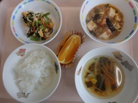 野菜たっぷり夏マ-ボ 小松菜の中華和え わかめス-プ ごはん オレンジ |