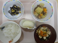 牛肉とじゃが芋の煮物 ひじきときゅりのサラダ かき玉汁 ごはん 梨 |